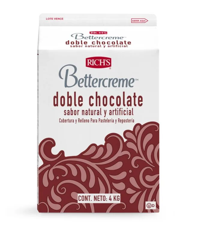 Crema vegetal líquida para batir, con sabor y aroma a chocolate intenso cremoso de textura suave, tersa y de fácil aplicación, estable a temperatura ambiente, ideal para cubrir, decorar y rellenar pasteles y postres.